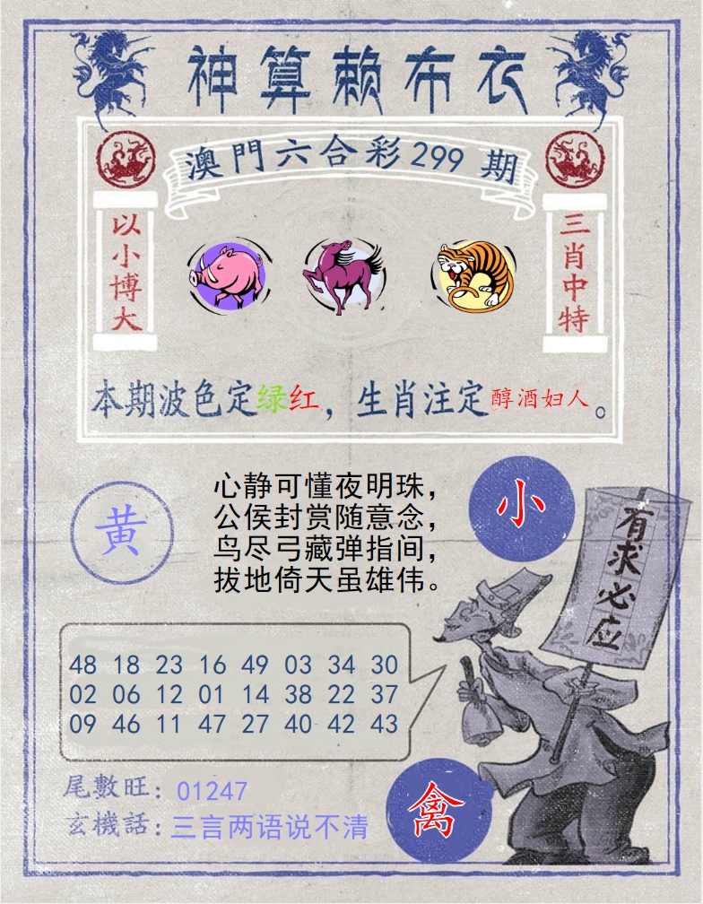 | 291期:今期生肖开金花,大将无帅找小姐,红兰今期有玄机,猜中单双有横财 |