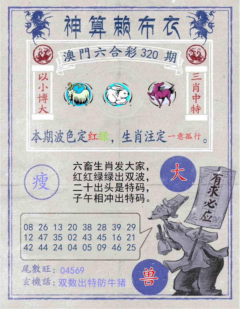 | 320期:六畜生肖发大家,红红绿绿出双波,二十出头是特码,子午相冲出特码 |